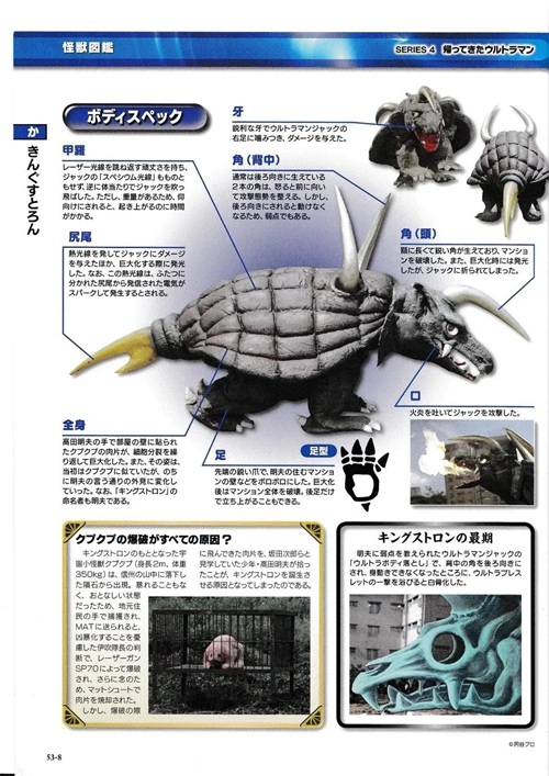 远古时代爬行类的后代,以放射性物质为食物,从尖锐的头角发射放射性光线和展开难以击破的屏障,即使是杰克奥特曼的光线技能和切割技能轮番攻击都对其屏障无效。在最后决战中,当头角被杰克奥特曼踢断后死于斯派修姆光线