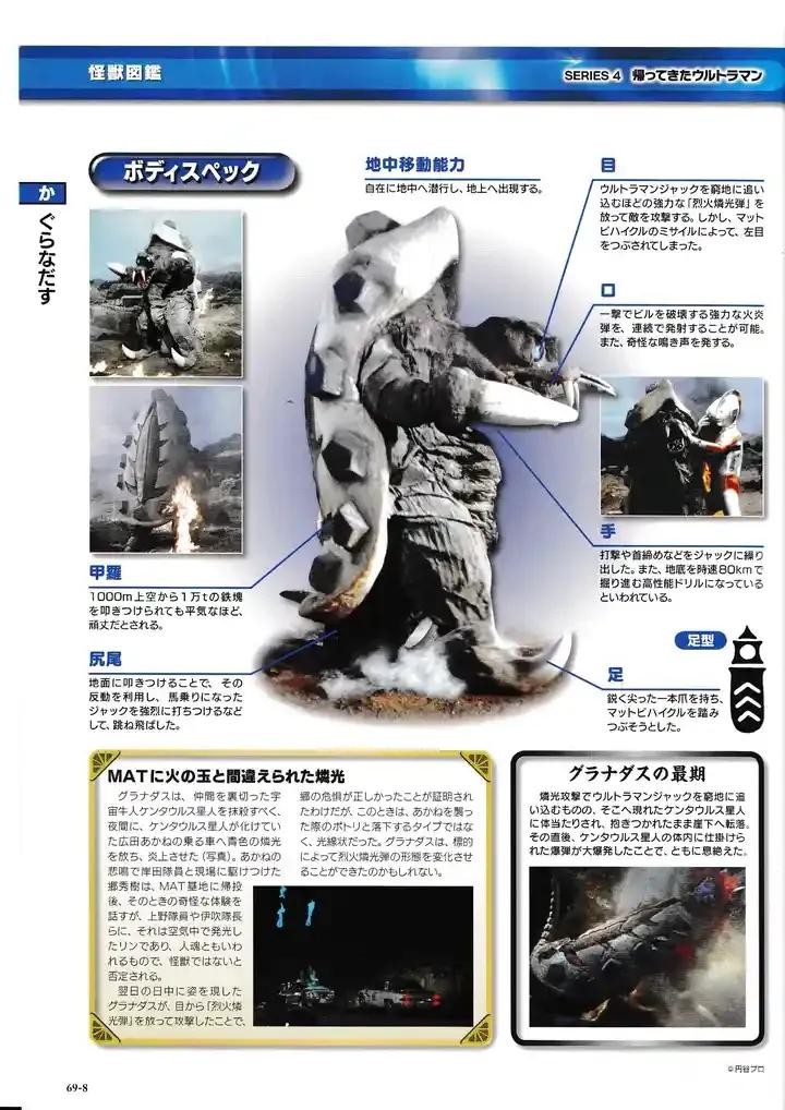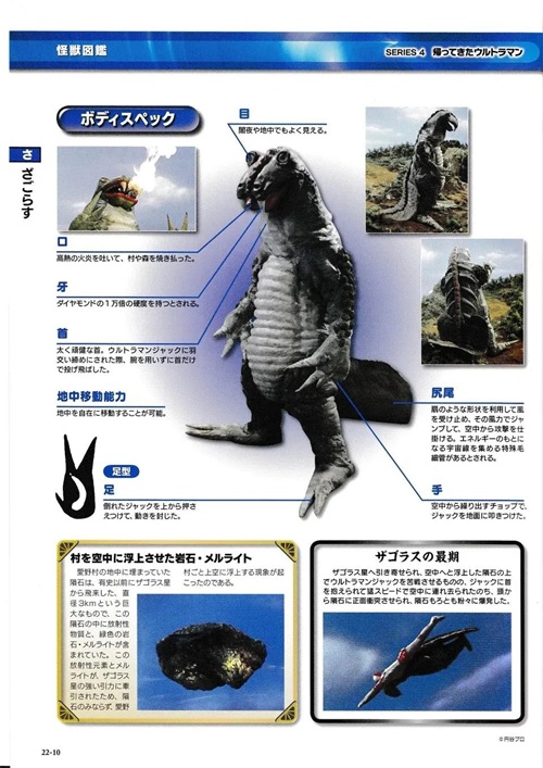 史前时代的外星微生物,附着在来自扎格拉斯星的陨石上一同来到地球,受到放射线影响而变异成为怪兽。居住在爱野村地下,口中能喷射出高热火焰,还拥有很强的跳跃力,最后与扎格拉斯星陨石相撞而死。