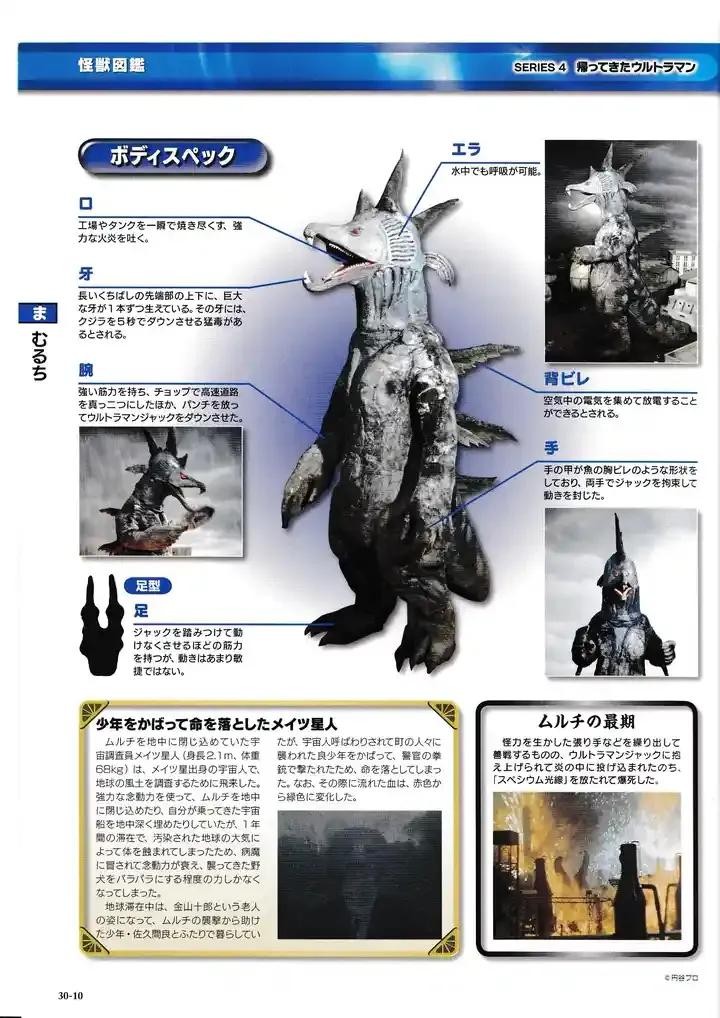 是一种介于鱼类和动物之间的怪兽,能在深海和地面之间自由往返活动,以巨大的鱼鳍和破坏光线为武器。1年前被梅茨星人用念力封印于地底,在梅茨星人死后封印解除,来到地面进行大肆破坏,最后在和杰克奥特曼的战斗中被击毙。