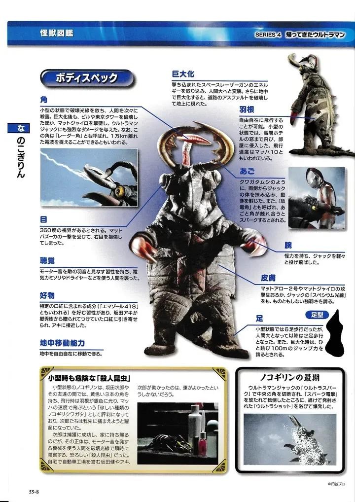 搭乘陨石从宇宙来到地球的宇宙甲虫,喜好吞食口红中的某些特殊成分,还将和马达的噪音同频率的存在视为自己的敌人,并从头上的触角放射镭射光攻击目标。后来在MAT的攻击下巨大化暴走、破坏城市。最后在「火花电击」和「奥特射线」的连续攻击下,诺科奇林终于被消灭。