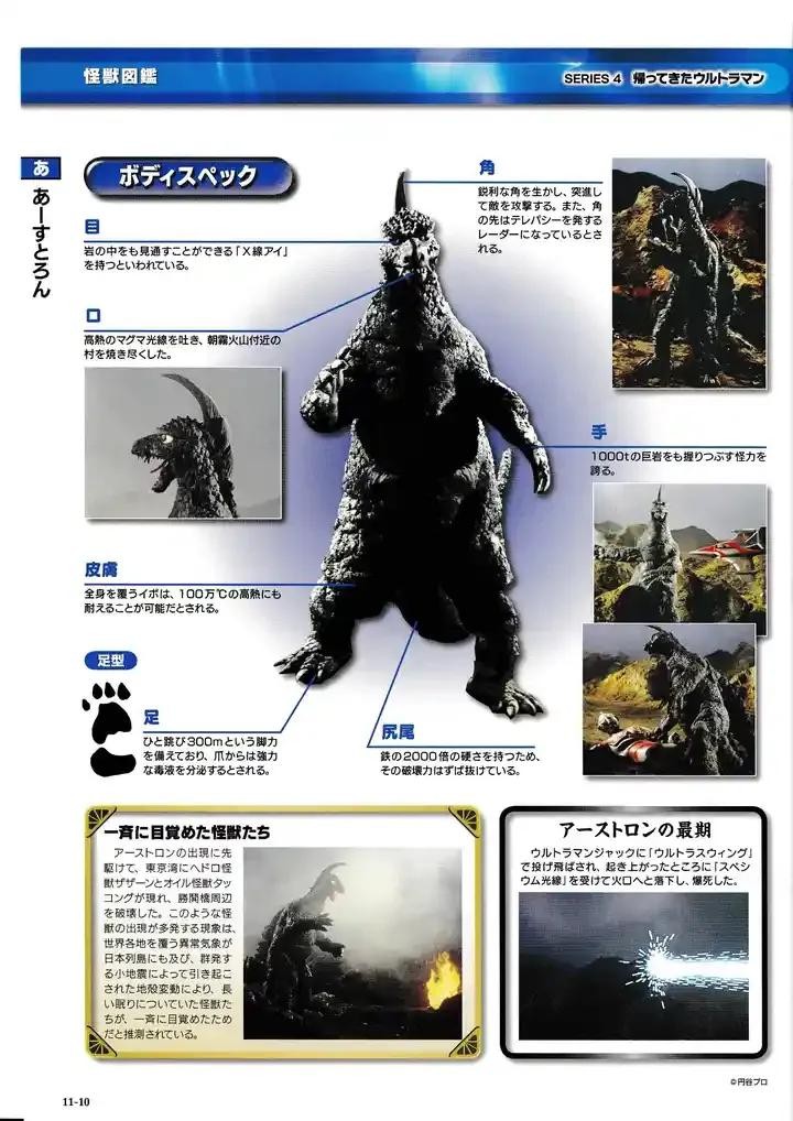 阿斯特隆出现于朝雾火山的地下怪兽。出现后大肆破坏周围的村庄,最后被杰克奥特曼的斯派修姆光线击毙。