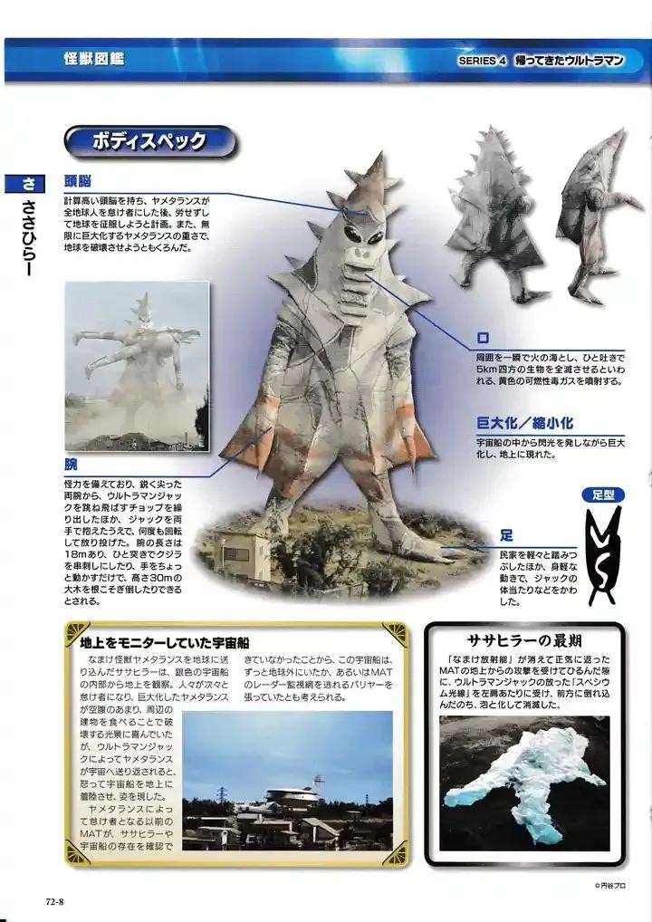 为了侵略地球而特意将怪兽亚美坦拉斯送来的宇宙人,性格残暴,在宇宙船内观视亚美坦拉斯造成的混乱。当怪兽被送回宇宙后现身,狂暴地破坏城市,和杰克奥特曼展开了战斗,在近战中展现自身的格斗能力,一度击倒了杰克奥特曼。但由于MAT队的火力援助,萨萨茜拉无法给杰克致命攻击,被杰克缓过来后使出的斯派修姆光线击中,化为白色泡沫而消灭。