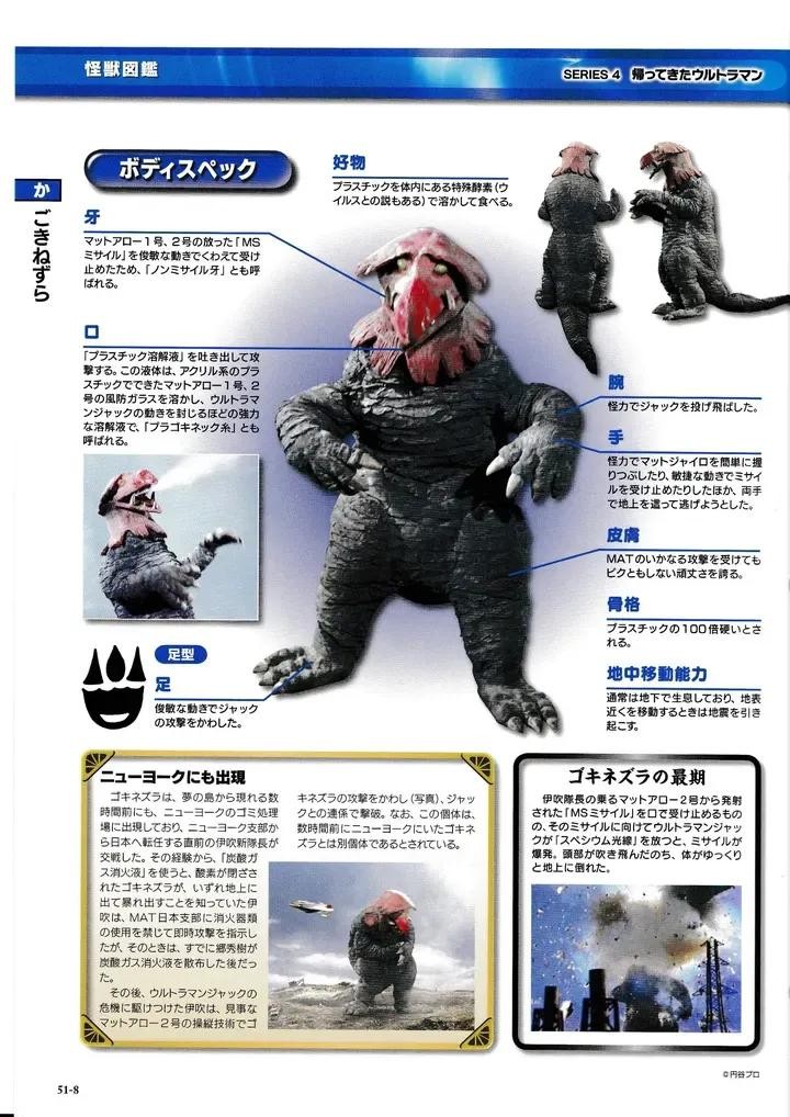 以吃塑料为食的怪兽,潜伏在梦之岛垃圾处理场的地下,不断吞吃塑料垃圾。口中吐出能轻易溶解塑料物品的塑料溶解液,也以此作为最大的武器。与杰克奥特曼伊吹队长利用哥克内茨拉喜欢用嘴咬住飞来的导弹这一特性,诱使哥克内茨拉咬住了MS导弹,杰克奥特曼趁机使用「斯派修姆光线」引爆导弹,炸碎了哥克内茨拉的头部,将怪兽消灭。