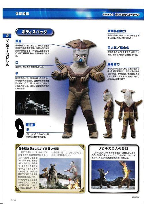 狡猾的外星侵略者,拟态成人类的样貌混入地球,绑架了MAT伊吹队长的家人作为人质,并制造出怪兽考达依格作为怪兽兵器。最后自己也巨大化上场作战,武器是双手的速射炮,古罗泰斯星人知道自己打不过杰克,于是躲在考达依格的背后,让杰克和考达依格僵持,自己则和MAT交火。最后,杰克摆脱考达依格,使用奥特手镯斩杀了古罗泰斯星人。