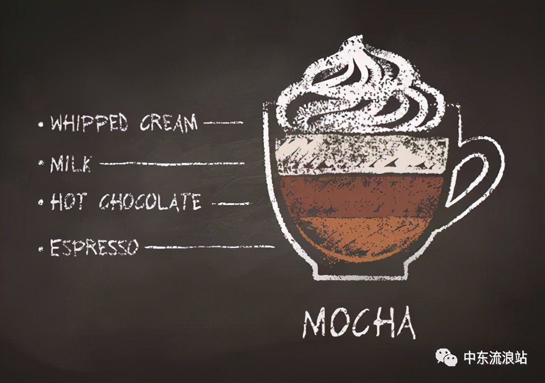● 摩卡咖啡的结构,从下到上:浓缩咖啡,热巧克力,牛奶,打发奶油