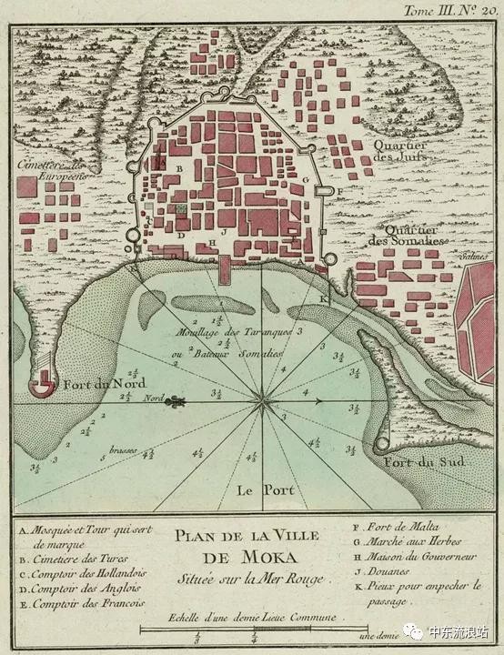 ● 1764年法国地图中的也门摩卡港,位于城堡外的分别是索马里区、犹太人和欧洲人区