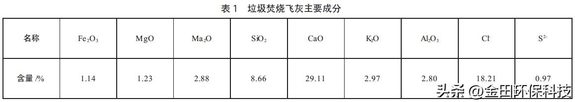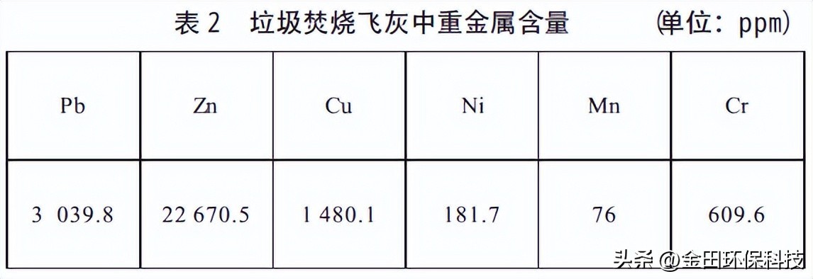 飞灰是把垃圾焚烧后通过热回收利用和烟气净化系统所收集到的物质。焚烧垃圾所产生飞灰量的多少同垃圾的类型、焚烧设备和处理工艺相关,通常是焚烧垃圾总量的3%~5%(垃圾分类好的城市飞灰产生量为2%~3%)。其主要物质及重金属含量分别见表1、表2。这部分重金属和有机化合物,具有非常高的浸出毒性,加大了处置飞灰所产生污染物的难度,如果不经过处理就排放到环境中,就非常容易对大气和水体等造成二次污染。