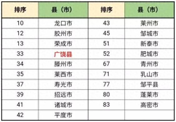 山东龙口位列第10名,胶州、荣成分列第12、13名。其中,东营广饶县也上榜名单。