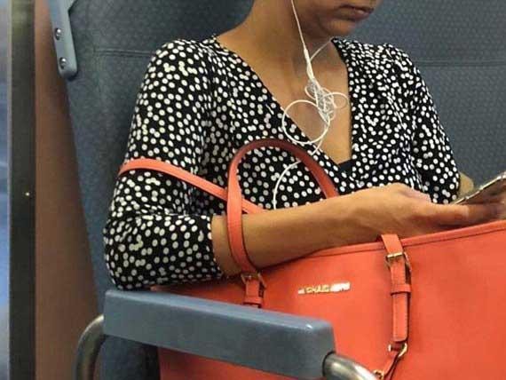 一名女士在用耳机听歌,但耳机线一团乱麻。