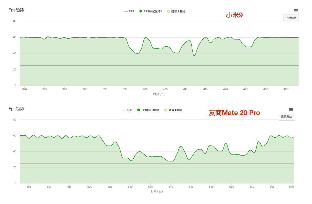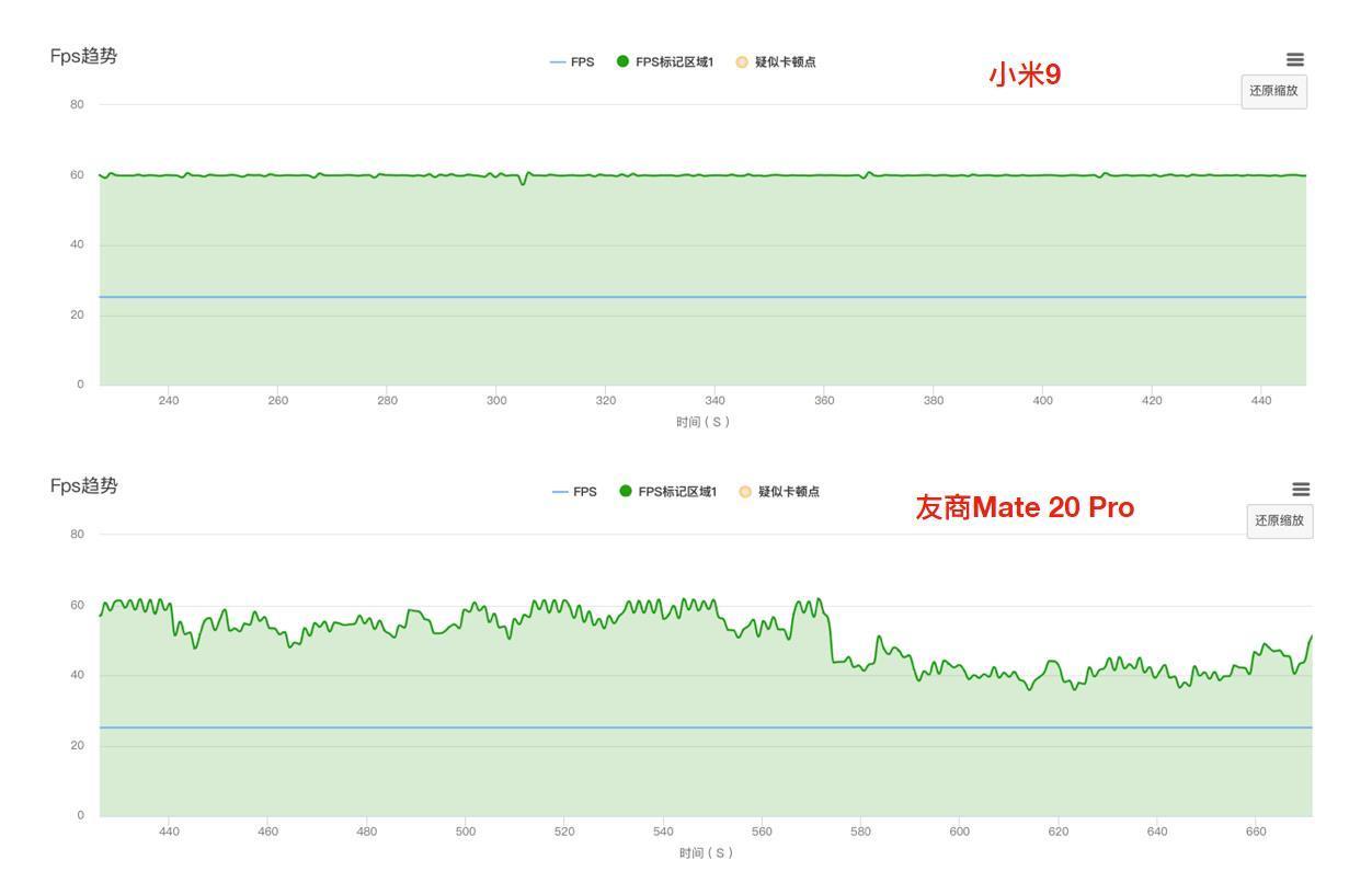 在MOBA游戏压力测试中,无CD模式奕星连续施放大招,技能画面效果复杂,渲染负载较大,可以明显看到小米9帧数曲线更加稳定,小米9平均帧率在59.9fps,而其他手机帧率波动较大,平均帧率50.7fps。