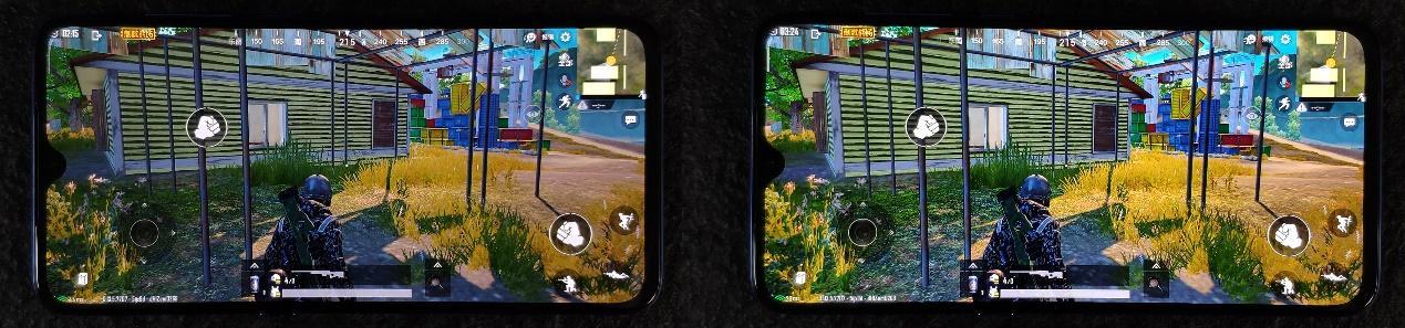 在吃鸡类游戏实测中,开启显示增强(右)和游戏默认画面(左)对比,可以明显看出画面色彩更加浓艳,整体界面更加明亮,对比度更高,草丛暗部细节清晰可见。