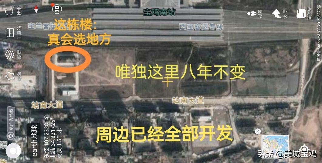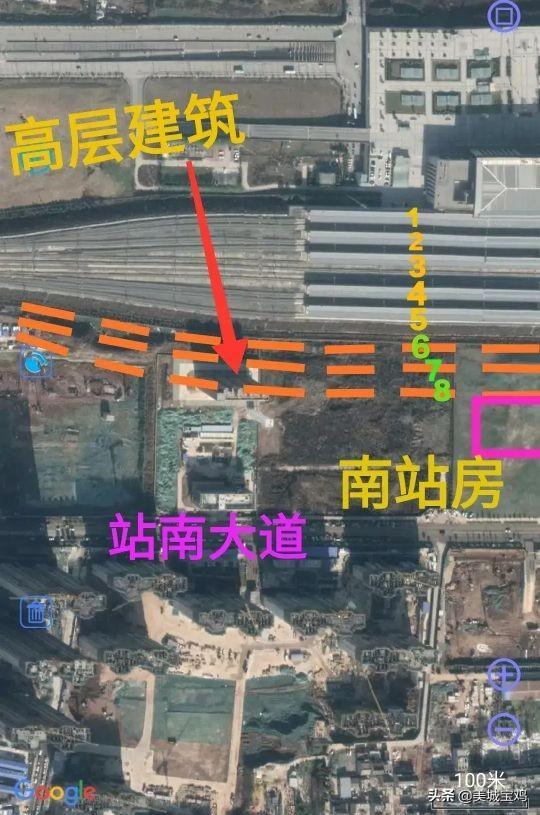 这栋距离宝鸡南站第五站台仅仅几十米的某部门高层建筑,在几年前就已经建好,而当时周边并没有明显的建筑,站南大道早已建成,周边已经逐渐发展成型。为什么,你要建在这里?哪怕你往南20米,也完全可以。