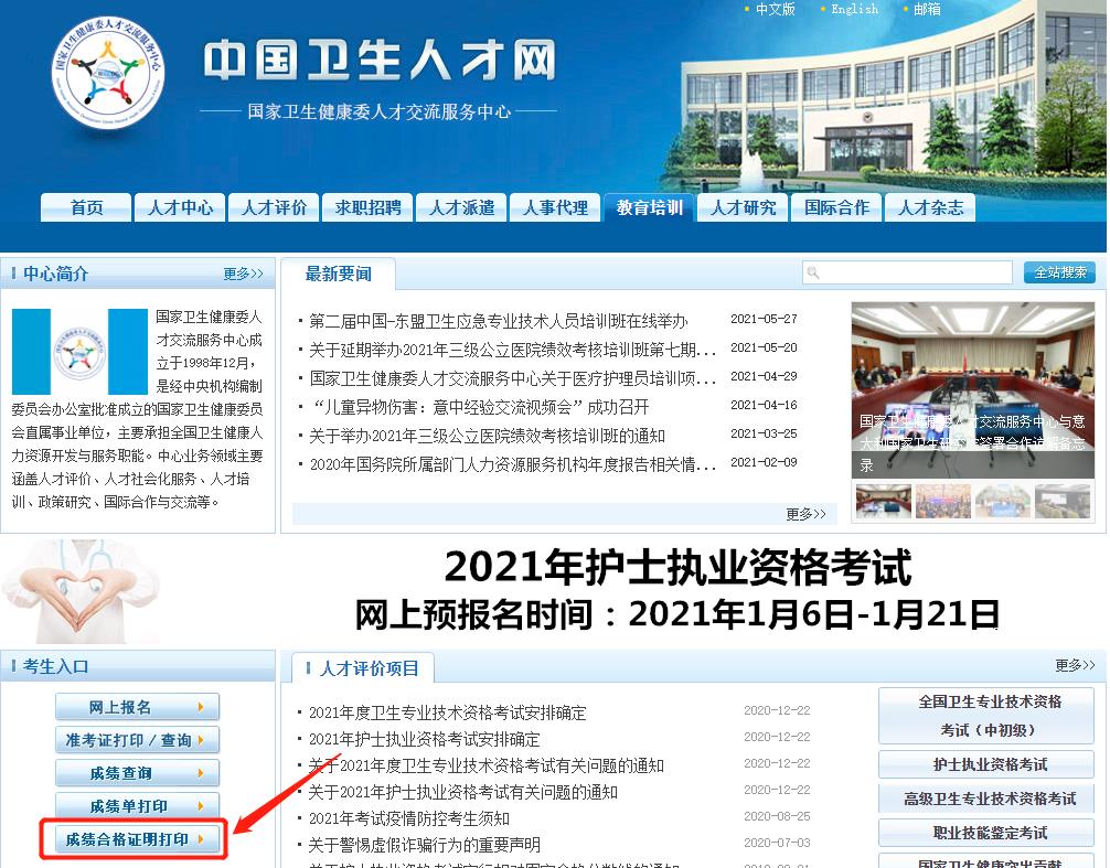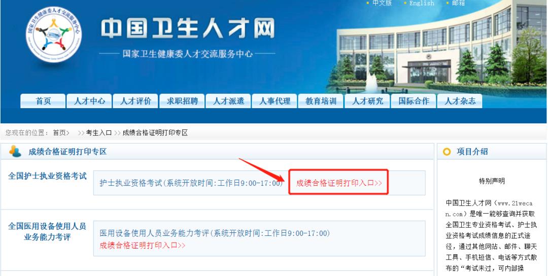 1、登陆中国卫生人才网找到 “考生入口” 区域;点击成绩合格证明打印。