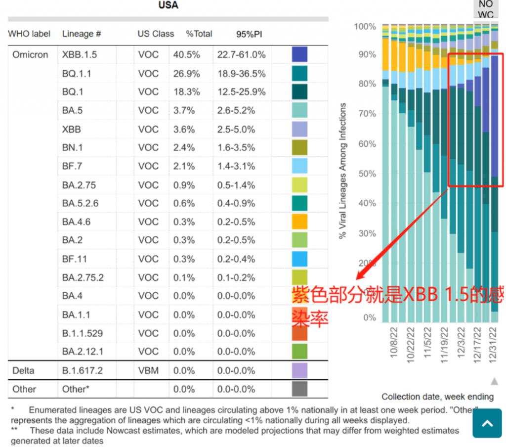 "XBB 里头有两个 B,意思是 BA.2.10.1 和 BA.2.75 的重组株,可以理解为这两个病毒株同时感染了某个人,然后在这个人的身体里完成了重组,因此,它本质上自然属于奥密克戎系列的毒株。" 陈永和表示,截至 2022 年 12 月 31 日,在美国流行的毒株中,XBB1.5 在去年 11 月下旬刚露头角,到了昨天已经占了 40.5%,近乎半壁江山。