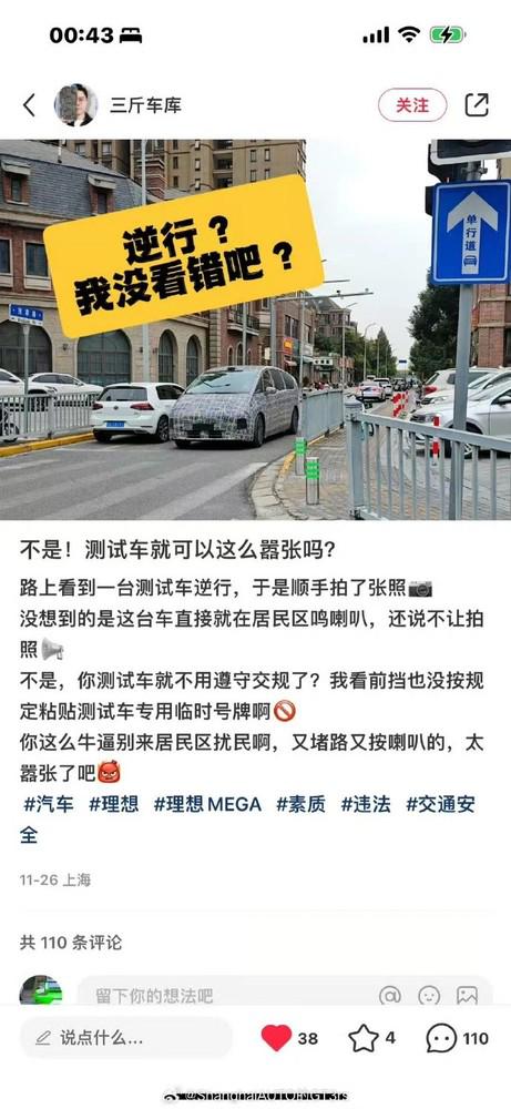 有网友在社交平台发文称,路上看到一台测试车逆行,于是顺手拍了张照片。没想到的是这台车直接就在居民区鸣喇叭,还说不让拍照。该网友十分愤怒,表示 " 测试车就不用遵守交规了?我看前挡也没按规定粘贴测试车专用临时车牌啊 "" 在居民区又堵路又按喇叭的,太嚣张了吧 "。