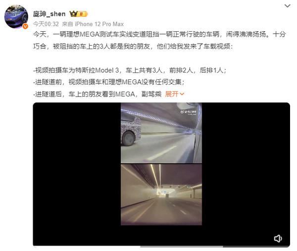 无独有偶,还有网友反映,今天,一辆理想 MEGA 测试车实线变道阻挡一辆正常行驶的车辆(特斯拉)。事件发生时该特斯拉和理想 MEGA 正在隧道行驶。进隧道前,视频拍摄车和理想 MEGA 没有任何交集;进隧道后,车上的朋友看到 MEGA,副驾乘客用手机拍摄 MEGA,未违反任何交通法规;即将出隧道时,MEGA 实线变道阻挡视频拍摄车。好在未造成事故,目前已上报深圳交警。