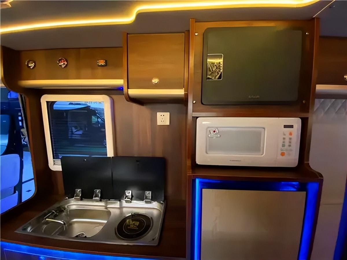 厨房区配备整体式灶具,带有洗菜池及电磁炉,方便乘客在车内做饭,灶具带有黑色玻璃盖板,不使用时可保持桌面平整。厨房区下方配备了英得尔房车专用冰箱,容积为49升。新车还标配了便携式燃气灶,乘客可在车外炒菜。