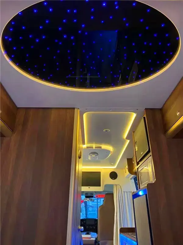 驾驶室布置了双排座椅,顶部有着宽阔的储物空间。 车厢前侧设置有两个航空按摩座椅,不管是造型还是皮面的质感都是极上档次的。通风、加热、按摩通通不在话下。车厢后侧有超大空间的独立卫浴、小沙发以及上下双床,车内的软包与抛光的木质家具结合的也是恰到好处,打开精心设计的氛围灯,高级感立刻就能够凸显出来。