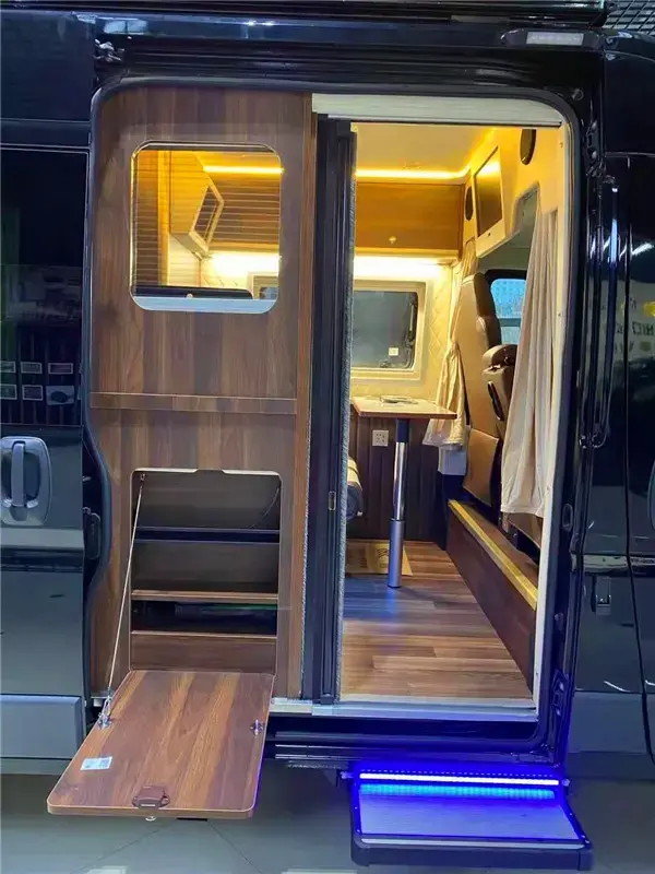 贯通式车内布局,车体中部是厨房和卫生间,尾部是横置的双人床。布局简单、空间宽敞是这款车内部设计的最大特点。厨房配备了带盖水槽、电磁炉和49L车载冰箱。车内配备了300Ah锂电池和3000W逆变器,车顶还安装了太阳能板。