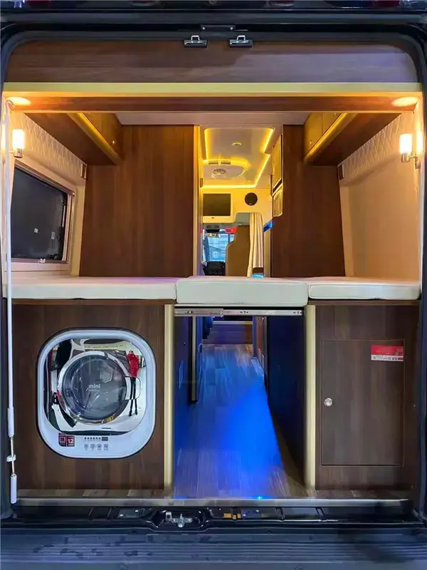 尾部横床,尺寸1850*1300mm,基本可以满足2个成年人的休息空间。这里安装了滚筒洗衣机;床下有着多个储物柜,床板也可以收起,增加了使用的灵活性,除了驻车空调,车内还有着汽油燃油暖风热水一体机,保障了房车生活的舒适度。