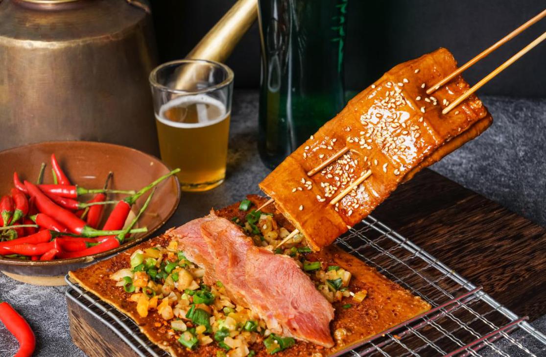 1、 烤苕皮+烤豆干,一串3元起,标配苕皮豆干、配料(酸萝卜、折耳根、葱等) 。