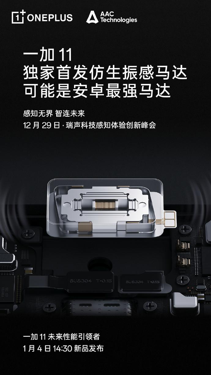 一加称,一加 11 将全球独家首发仿生振感马达,该马达由一加携手 AAC 瑞声科技共同打造,并称 " 这可能是安卓最强马达!"
