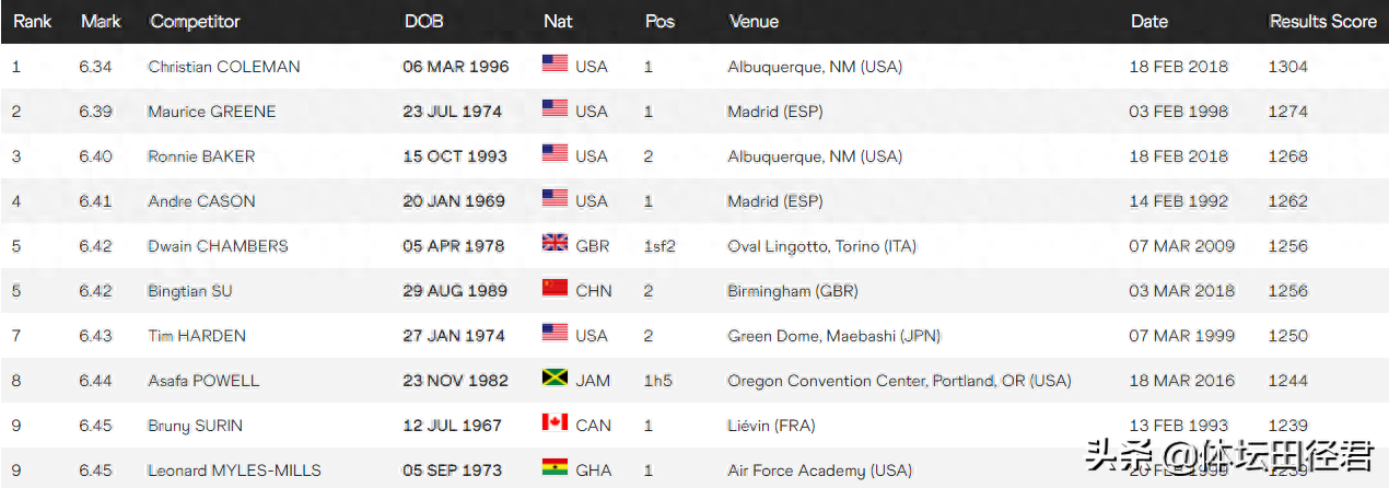 美国老牌飞人格林1998年在马德里室内赛创造6秒39世界纪录,其实他还可跑得更快,20年后才被科尔曼打破,格林百米最佳9秒79,获得悉尼奥运会金牌和雅典奥运会铜牌。