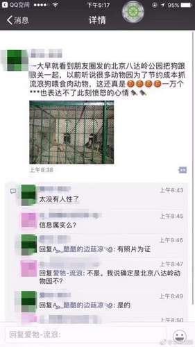 “太缺德了,北京八达岭野生动物园把狗狗喂老虎,喂狼。求扩散!”日前,有网友发帖称,听说存在虎犬同笼现象,害怕狗狗被老虎吃掉。还有多名网友公布照片表示,看到了小狗和狼在一起的画面,希望有关部门出面制止。