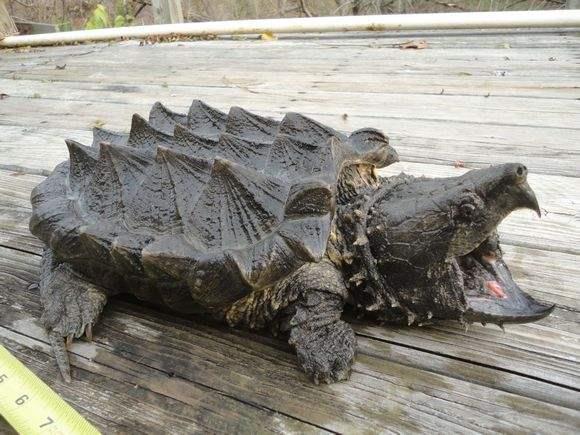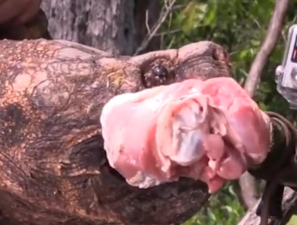 虽然不怕死但 是为了保险起见,老外还是先用一个和自己手臂差不多 大的火鸡腿做了测试,当他将一个火鸡腿放到鳄龟面前 的时候,这只凶猛的鳄龟立刻就发起了攻击,强大的咬 合力直接将火鸡腿咬了对穿,还咬下了一块肉。