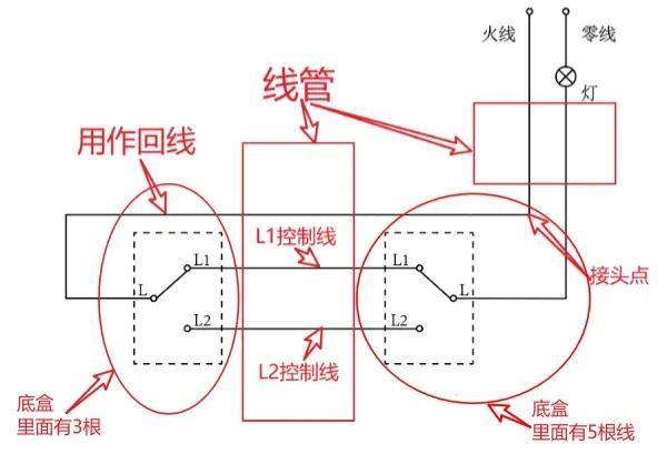 为了更好帮助大家了解,实际家装中的接线,再图2的基础上,标注有线管、底盒、接头点、回线。实际中L1和L2控制线是交叉接的,开关没按下时,灯是关闭的状态,考虑到交叉接看着会有点乱,这块就画成平行了,方便讲解。看的懂前面的图,不代表一定会接线,这里指的是暗线。