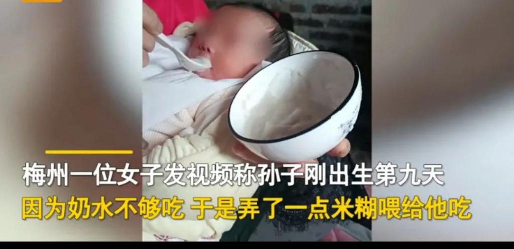 12 月 10 日,广东梅州一位女子发视频称孙子刚出生第九天,因为奶水不够吃,于是弄了一点米糊喂给他吃。