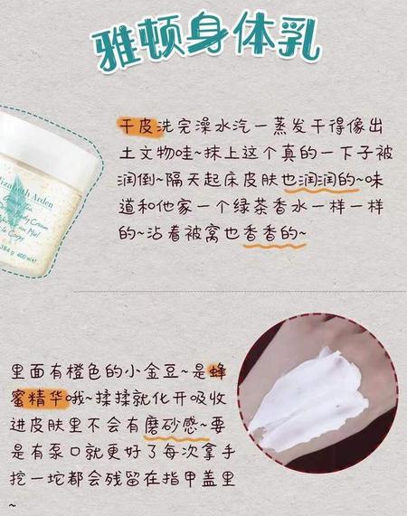 干皮洗完澡水汽一蒸发干得像出土文物哇~抹上这个真的一下子被润倒~隔天早上起床还是很润~味道和他家一个绿茶香水一样一样的~沾着被窝也香香的~里面有橙色的小金豆~是蜂蜜精华哦~揉揉就化开吸收进皮肤里不会有磨砂感~要是有泵口就更好了每次拿手挖一坨都会残留在指甲盖里