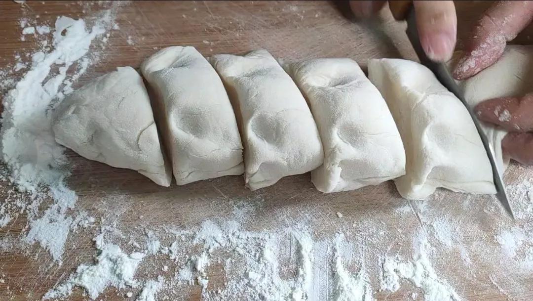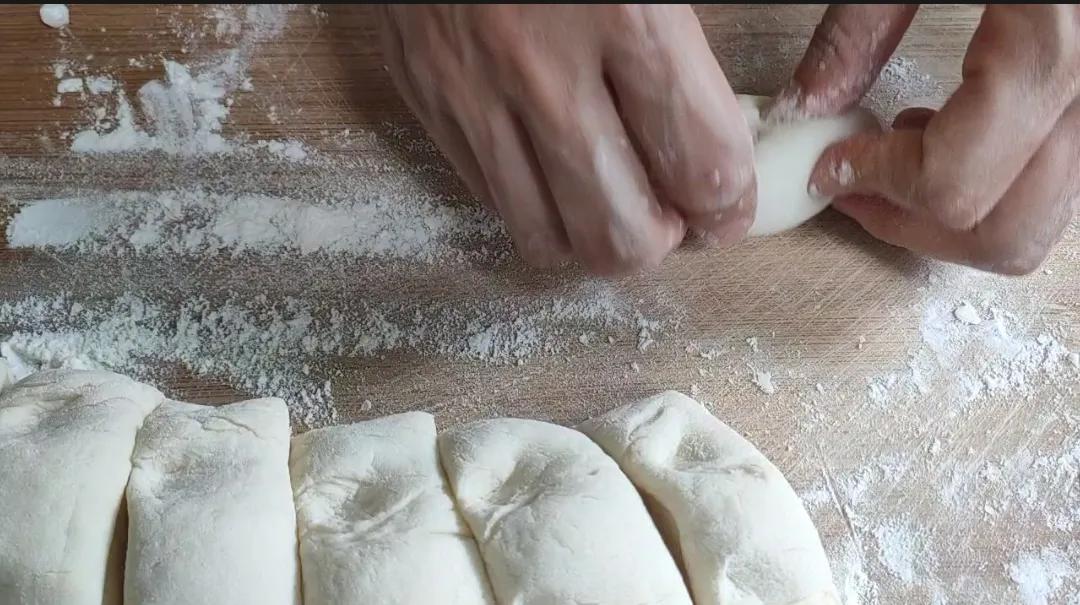 5分钟过后再揉搓,就非常容易揉光滑了。揉搓好后,我们先把它整理成长条,然后用刀子切成大小一样的面剂