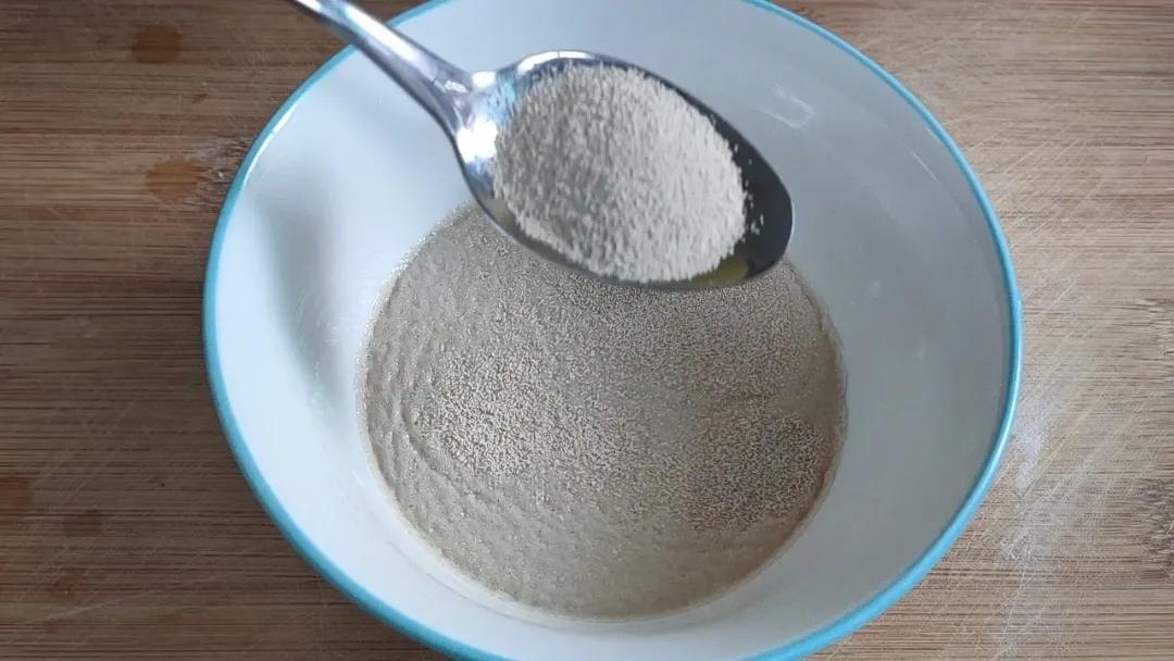 首先我们在盘中准备500克的面粉。另在碗中准备100克的温水,然后加入5克的酵母粉,搅拌均匀,把酵母粉完全融化放在一旁备用。