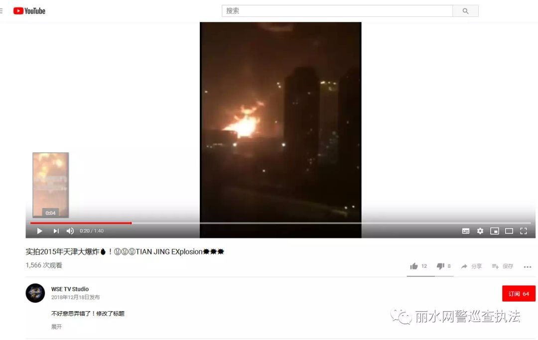 当晚,事件出现反转,公众号丽水网警巡查执法发布消息,称这段视频是2015年的“天津大爆炸事件”,是由一位美国网友在2公里远的高楼上拍摄的。