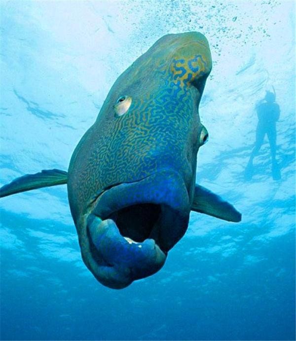 看这拍摄出来的苏眉鱼是不是觉得很搞怪呢,的确,苏眉鱼平时就是那么搞怪可爱,它的嘴巴是它的一大特色,它整个呈现铁蓝色,并且会长出突出的嘴巴。