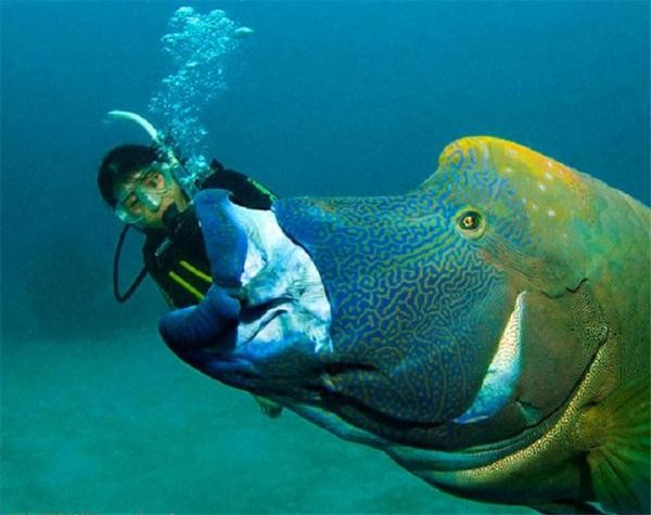 看图中的潜水员与苏眉鱼的合照,看着它的大嘴是不是觉得能拍出这样错位的照片也没什么稀奇呢,在图中看,苏眉鱼都和潜水员差不多大呢,让网友直呼不可思议。