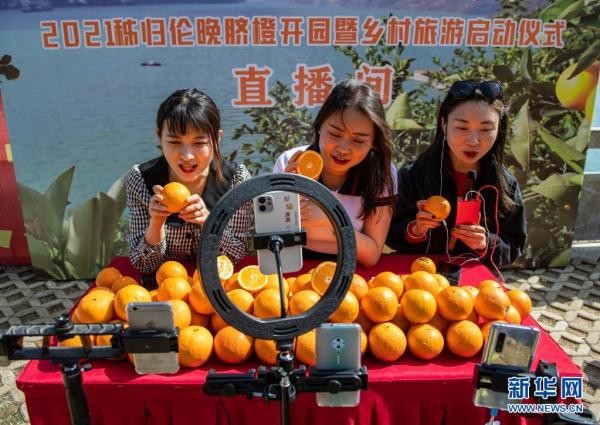 3月28日,几名主播在秭归春季脐橙开园现场直播推介春季脐橙。