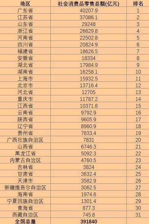 以下是我国各省2020年社会消费品零售总额排名(不含港澳台),可以看到,我国各省消费实力前十名为广东省、江苏省、山东省、浙江省、河南省、四川省、福建省、安徽省、湖北省和湖南省,以上十个省份都是我国经济大省和强省。