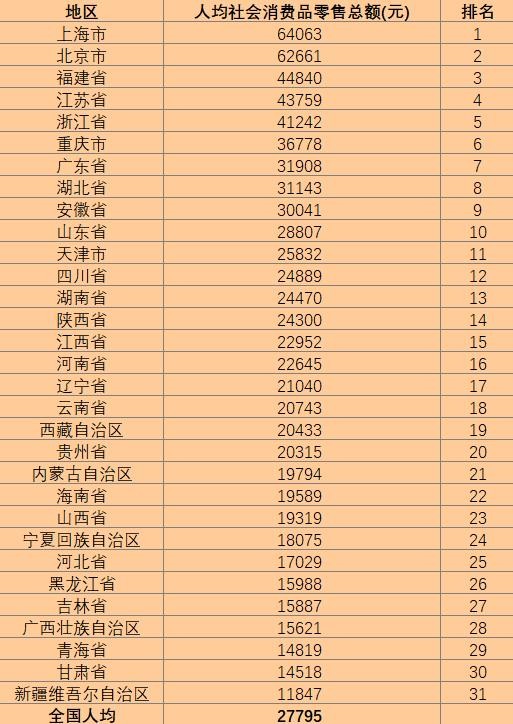 以下是我国各省2020年人均社会消费品零售总额排名(不含港澳台),可以看到,我国各省人均社会消费品零售总额前十名为上海市、北京市、福建省、江苏省、浙江省、重庆市、广东省、湖北省、安徽省和山东省,以上都是我国较为富裕的地区。全国人均社会消费品零售总额为27795元。