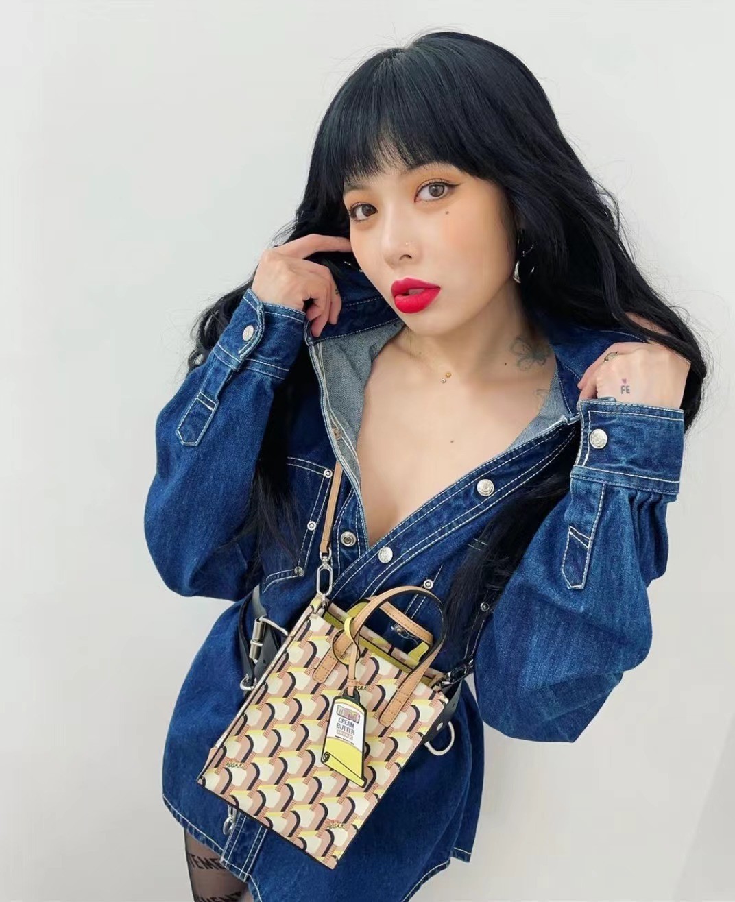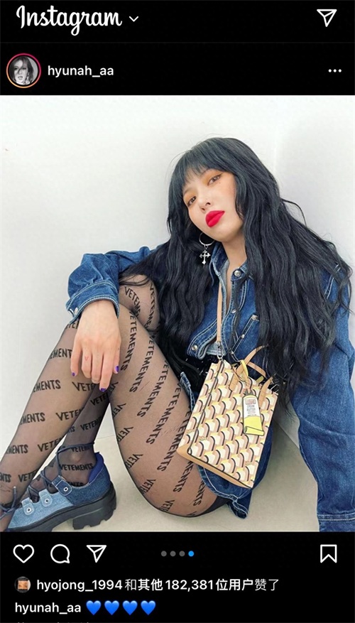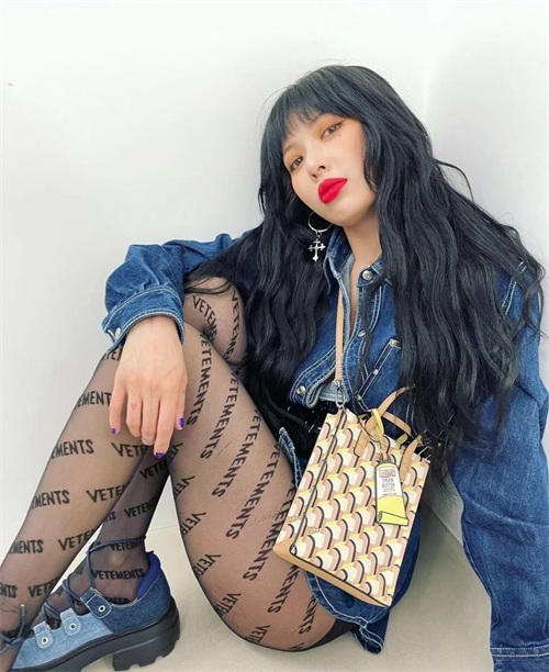 220517_泫雅ins更新:牛仔裙、字母丝袜,黑发红唇性感撩人