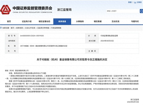 根据有关规定,浙江证监局决定对蚂蚁基金采取责令改正的行政监管措施,并要求其应高度重视,严格对照基金销售相关法律法规,采取切实有效的整改措施落实整改,并提交书面整改报告。