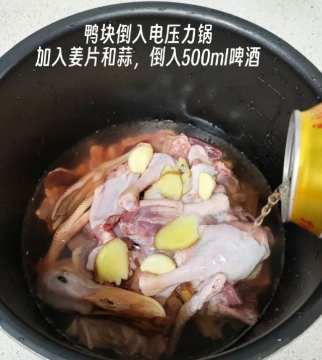 2⃣然后,把鸭块倒入电压力锅,加姜片+蒜+适量盐。倒入500ml啤酒