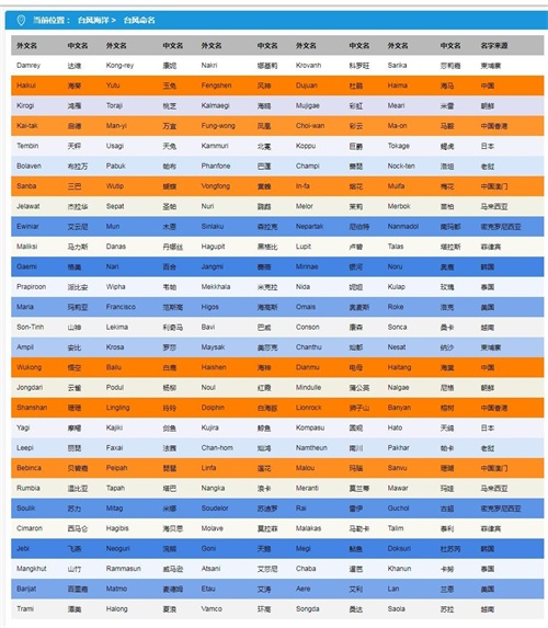 天兔-帕布-蝴蝶-圣帕-木恩-丹娜丝-百合韦帕-范斯高-利其马-罗莎-白鹿-洋酒-玲玲-剑鱼-法茜-琵琶-塔巴-米娜-海贝思-浣熊-威马逊-麦德姆-夏浪……以此类推。