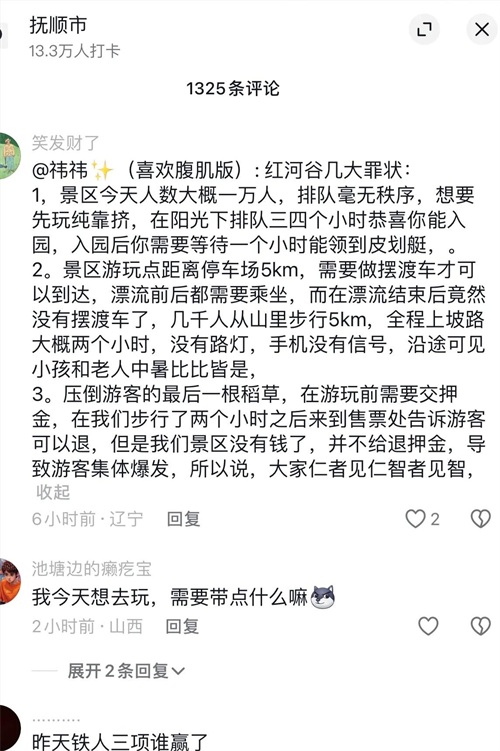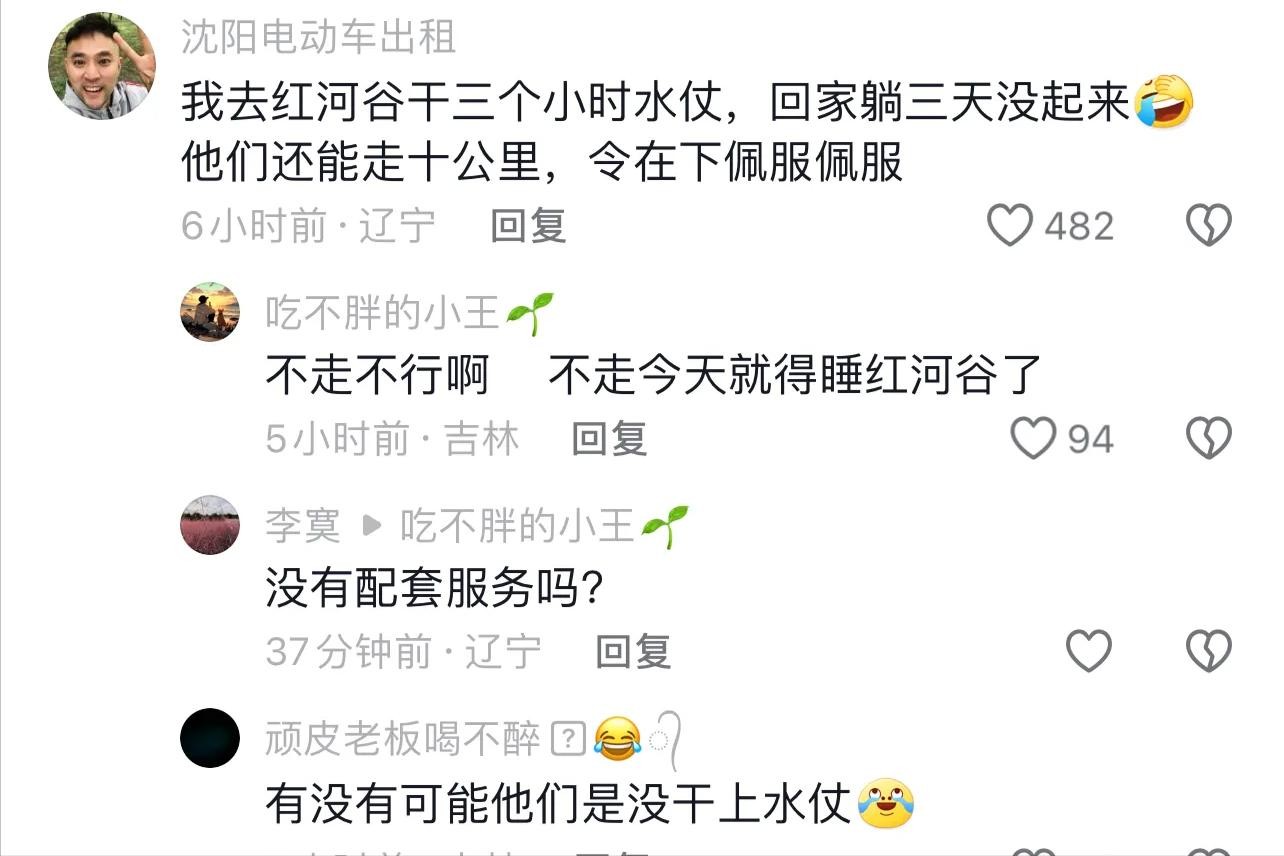 有人戏谑道:“红河谷漂流,直接升级成了铁人三项挑战赛,漂流、打水仗、徒步十公里,这水质,申请个国际赛事分会场都不为过。”虽是玩笑话,却透露出对景区管理深深的无奈与失望。
