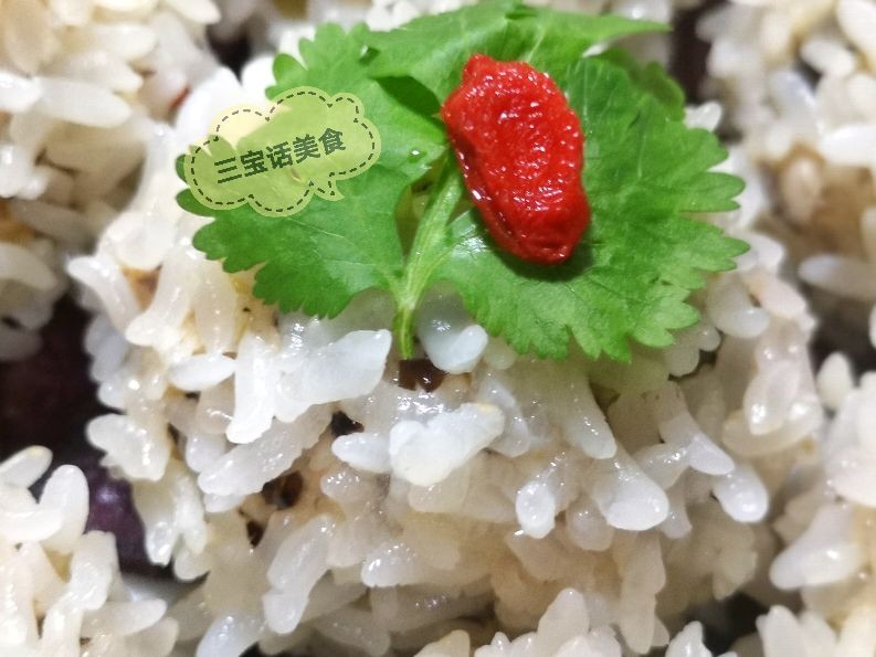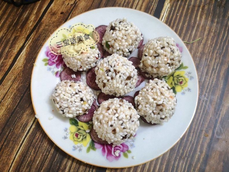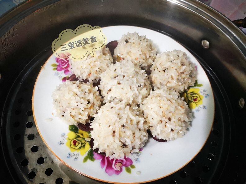 6. 取出一大勺肉馅,用手团成丸子,然后在滤水后的糯米上滚一圈,让丸子均匀沾上糯米,然后放到盘子里的紫薯片上,把做好的珍珠丸子一个个都码放好;