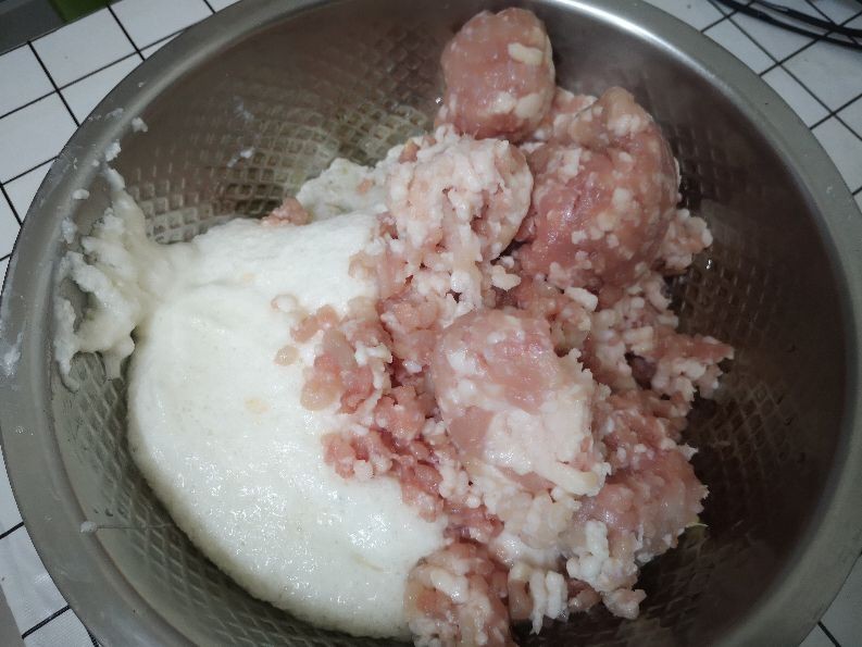2.如果没有山药泥的话,要分次加入一点清水,直到肉馅搅拌到粘稠为止,这样才会比较劲道。
