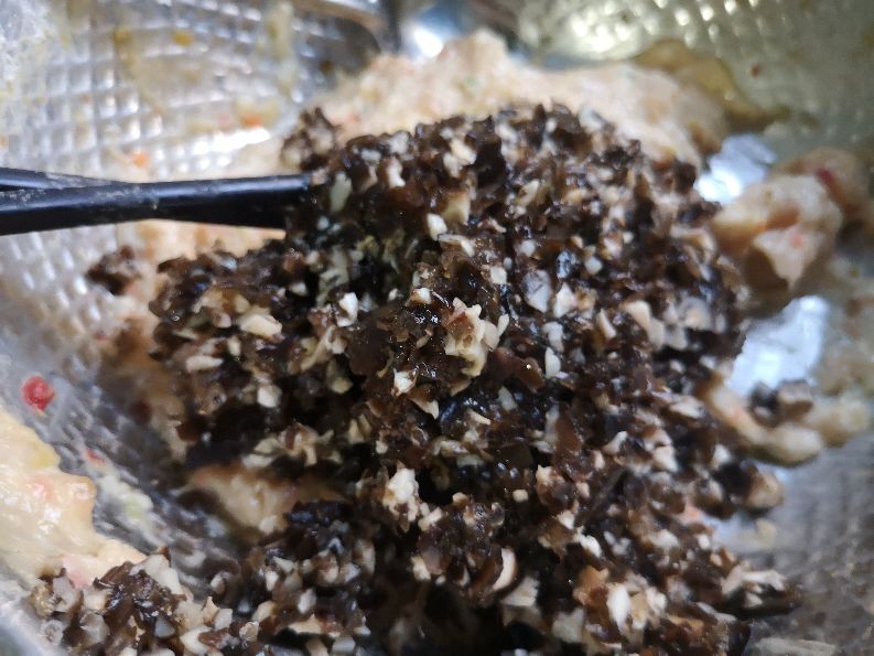 3. 香菇和木耳都泡发好,葱姜切碎,一起剁成碎末,倒入肉馅里面,顺着一个方向,搅拌均匀;