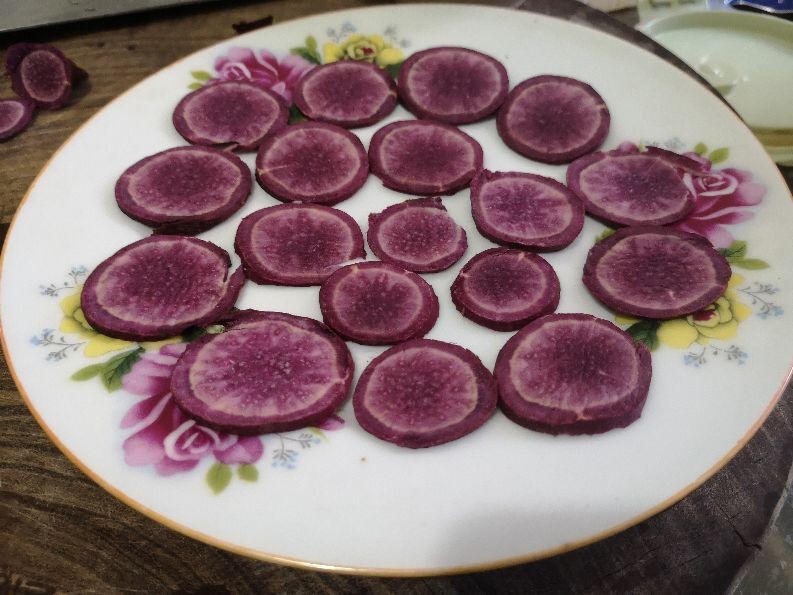 5. 紫薯一个,洗干净,切成薄片,一片片平铺在盘子中;