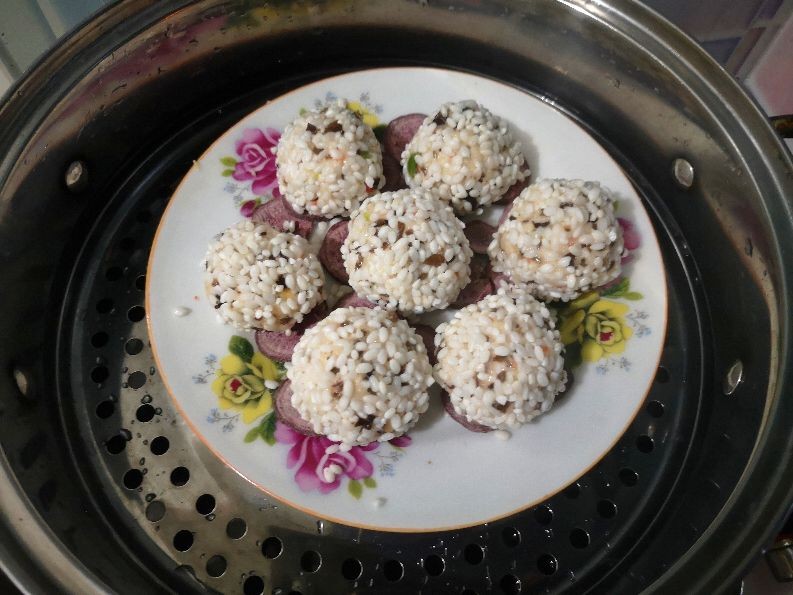 7. 蒸锅里加入适量水,把珍珠丸子放到篦子上,大火烧开,转中火蒸30分钟;